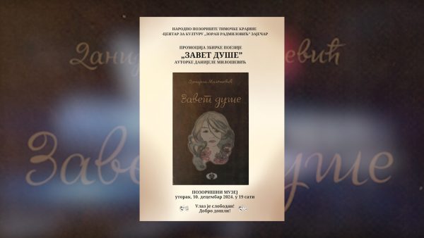 U zaječarskom Pozorišnom muzeju u utorak, 10. decembra biće priređeno muzičko – poetsko veče sa Danijelom Milošević i njenim prijateljima. Ona je dugogodišnji pedagoški radnik iz Knjaževca. Više od dvadeset godina vodi dramsku sekciju, piše dramske tekstove, poeziju za odrasle i decu i urednik je poetskih večeri na festivalu „Nišvil“. Kako je najavljeno, publici će od 19 sati biti predstavljena njena prva zbirka poezije „Zavet duše“.